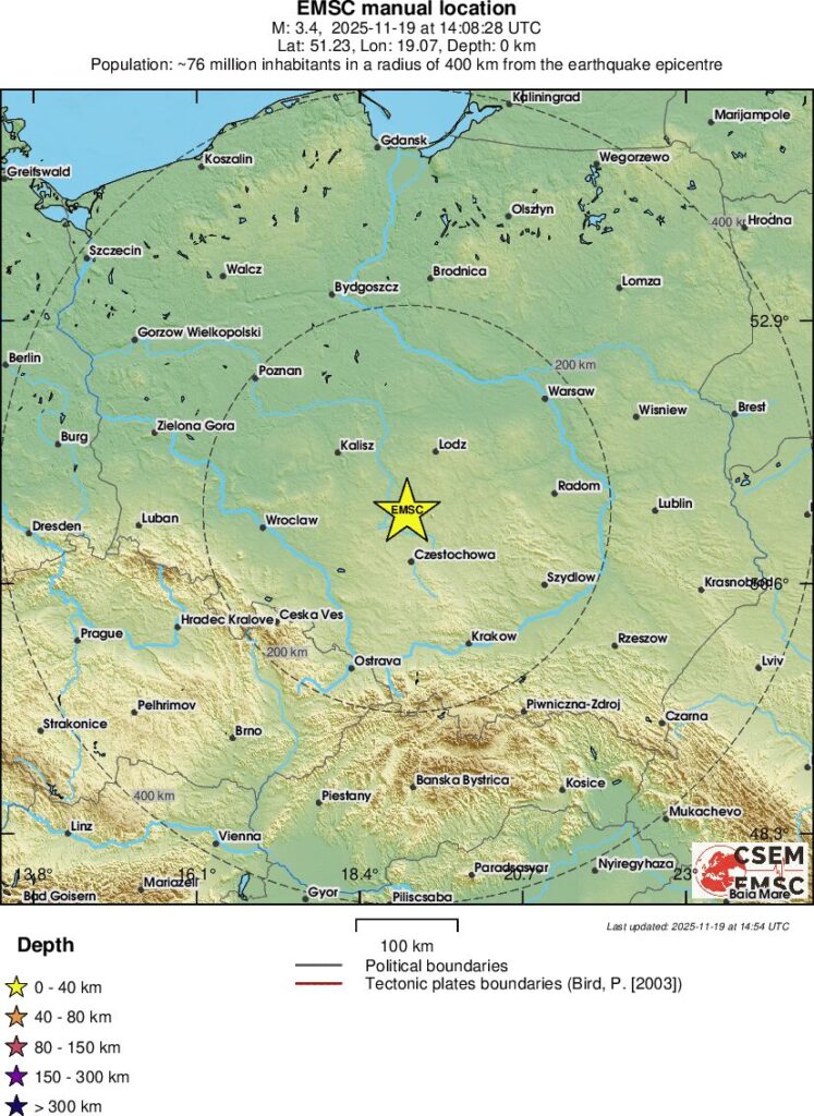 Stanowiska monitoringu sejsmicznego PLSN Instytutu Geofizyki PAN (IG PAS) zarejestrowały w dniu 19 listopada 2025 roku wstrząs sejsmiczny o magnitudzie 3.4. Wstrząs ten wystąpił dokładnie o godzinie 15:08:29 (14:08:29 czasu UTC), natomiast jego hipocentrum znajdowało się w lokalizacji: 51.27,19.07. Wyznaczone wyżej parametry zostały zweryfikowane przez sejsmologa. Wstrząs ten jest kolejnym odnotowanym przypadkiem sejsmiczności występującej w okolicy kopalni odkrywkowej w Bełchatowie, jednakże wstrząsy w niniejszej okolicy nie są częste.